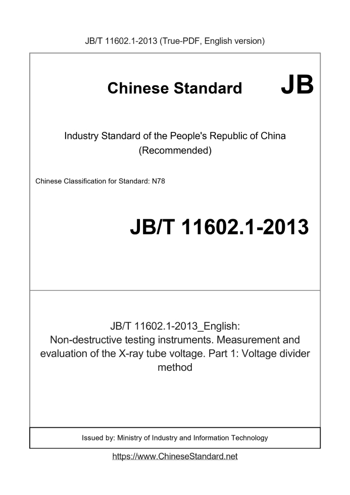 Delivery: <= 3 days. True-PDF full-copy in English will be manually translated and delivered via email. JB/T 11602.1-2013: Non-destructive testing instruments. Measurement and evaluation of the X-ray tube voltage. Part 1: Voltage divider method Status: Valid