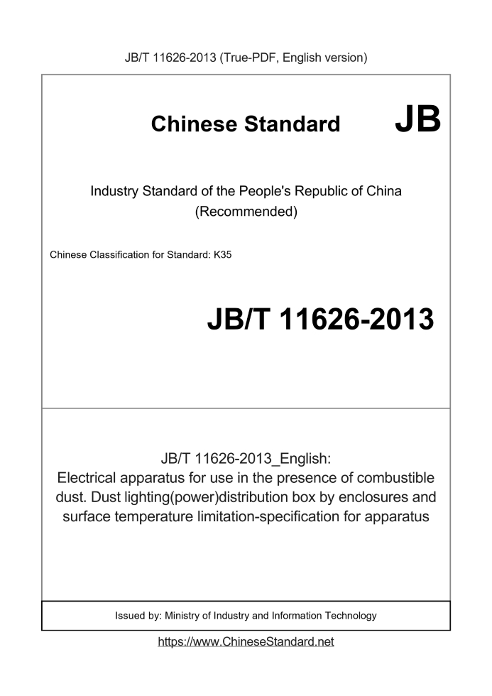 Delivery: <= 3 days. True-PDF full-copy in English will be manually translated and delivered via email. JB/T 11626-2013: Electrical apparatus for use in the presence of combustible dust. Dust lighting(power)distribution box by enclosures and surface temperature limitation-specification for apparatus Status: Valid
