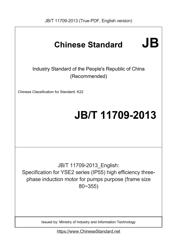 Delivery: <= 6 days. True-PDF full-copy in English will be manually translated and delivered via email. JB/T 11709-2013: Specification for YSE2 series (IP55) high efficiency three-phase induction motor for pumps purpose (frame size 80~355) Status: Valid