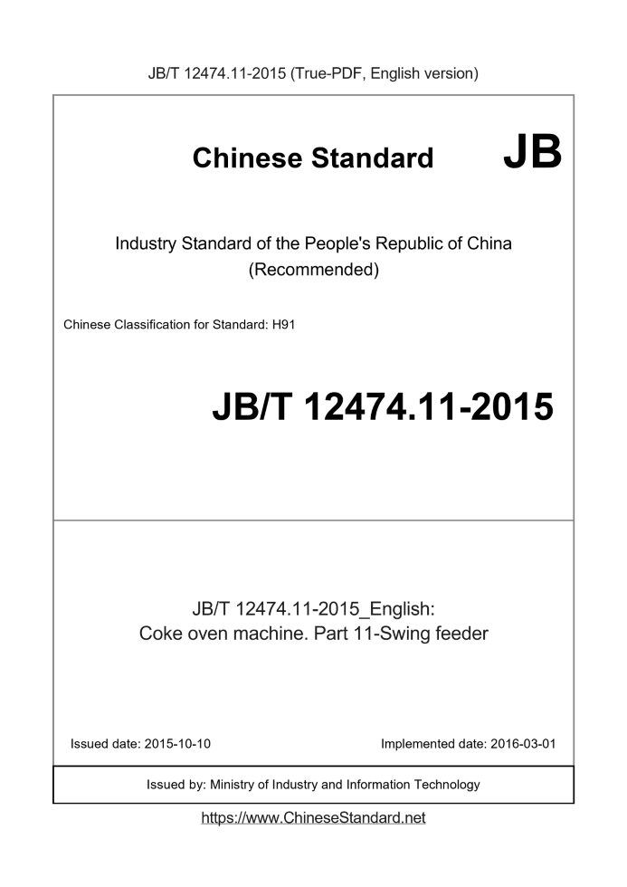 Delivery: <= 3 days. True-PDF full-copy in English will be manually translated and delivered via email. JB/T 12474.11-2015: Coke oven machine. Part 11-Swing feeder Status: Valid