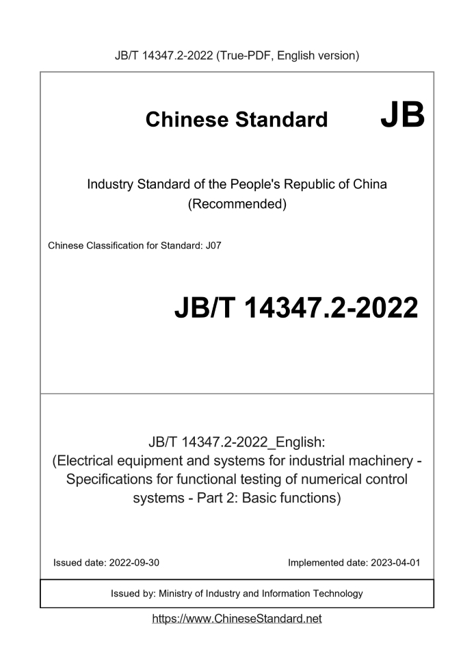 Basic dataStandard ID: JB/T 14347.2-2022 (JB/T14347.2-2022)Description (Translated English): (Electrical equipment and systems for industrial machinery - Specifications for functional testing of numerical control systems - Part 2: Basic functions) Sector / Industry: Mechanical & Machinery Industry Standard (Recommended) Classification of Chinese Standard: J07 Classification of International Standard: 29.040 Date of Issue: 2022-09-30 Date of Implementation: 2023-04-01 Issuing agency(ies): Ministry of Industry and Information Technology Summary: This standard specifies the basic functional test items, test content requirements and test methods in CNC system functional testing. This standard is applicable to the basic functional testing of CNC systems used in mechanical equipment such as metal cutting machine tools, electric discharge machine tools, and laser processing machine tools. The basic functional testing of CNC systems in other similar equipment can be used as a reference. Tips & Frequently Asked Questions:Question 1: How long will the true-PDF of JB/T 14347.2-2022_English be delivered?Answer: Upon your order, we will start to translate JB/T 14347.2-2022_English as soon as possible, and keep you informed of the progress. The lead time is typically 1 ~ 3 working days. The lengthier the document the longer the lead time.Question 2: Can I share the purchased PDF of JB/T 14347.2-2022_English with my colleagues?Answer: Yes. The purchased PDF of JB/T 14347.2-2022_English will be deemed to be sold to your employer/organization who actually pays for it, including your colleagues and your employer's intranet.Question 3: Does the price include tax/VAT?Answer: Yes. Our tax invoice, downloaded/delivered in 9 seconds, includes all tax/VAT and complies with 100+ countries' tax regulations (tax exempted in 100+ countries) -- See Avoidance of Double Taxation Agreements (DTAs): List of DTAs signed between Singapore and 100+ countriesQuestion 4: Do you accept my currency other than USD?Answer: Yes. If you need your currency to be printed on the invoice, please write an email to Sales@ChineseStandard.net. In 2 working-hours, we will create a special link for you to pay in any currencies. Otherwise, follow the normal steps: Add to Cart -- Checkout -- Select your currency to pay. |