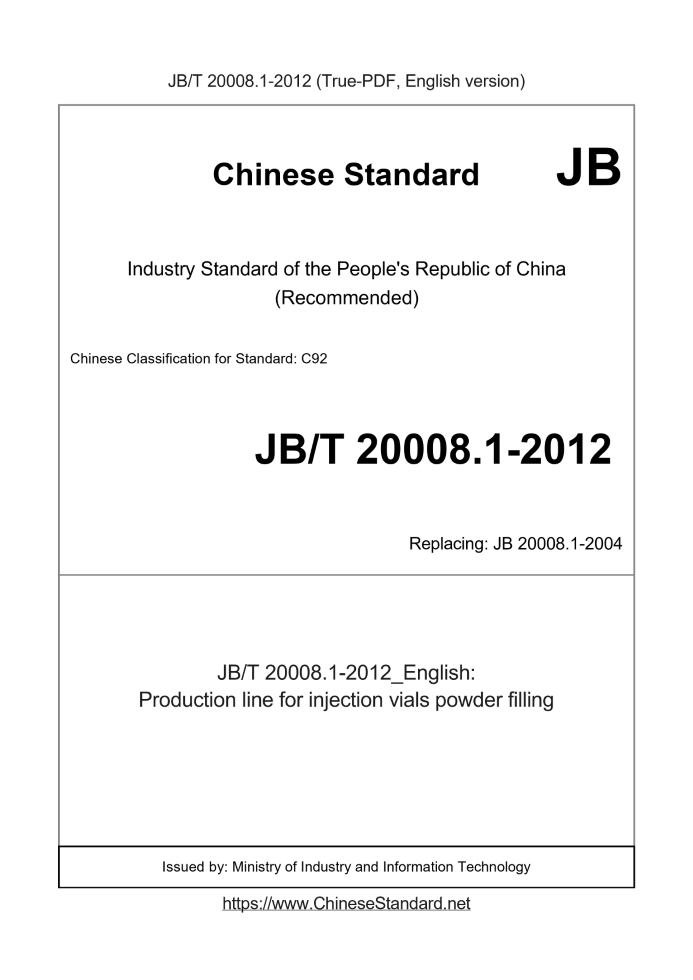 Delivery: <= 3 days. True-PDF full-copy in English will be manually translated and delivered via email. JB/T 20008.1-2012: Production line for injection vials powder filling Status: Valid JB/T 20008.1: Historical versions