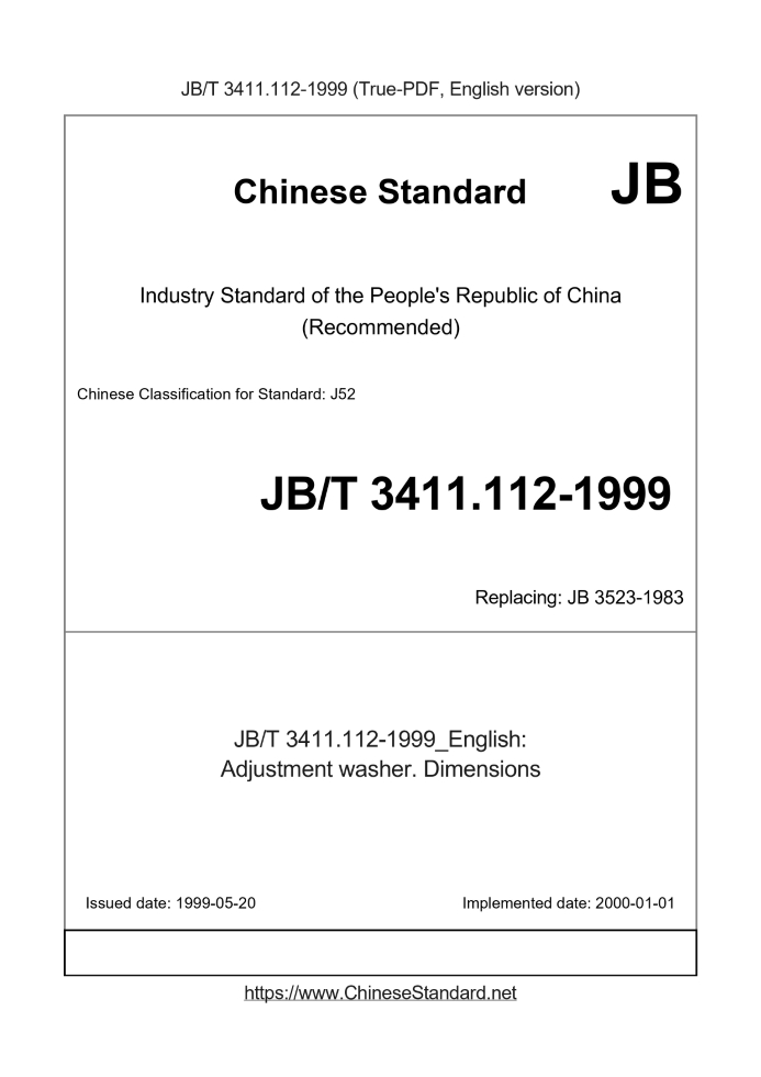 Delivery: <= 2 days. True-PDF full-copy in English will be manually translated and delivered via email. JB/T 3411.112-1999: Adjustment washer. Dimensions