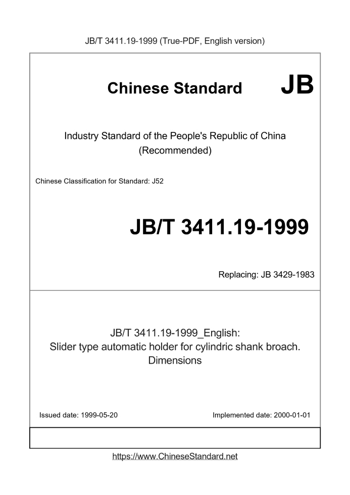 Delivery: <= 2 days. True-PDF full-copy in English will be manually translated and delivered via email. JB/T 3411.19-1999: Slider type automatic holder for cylindric shank broach. Dimensions