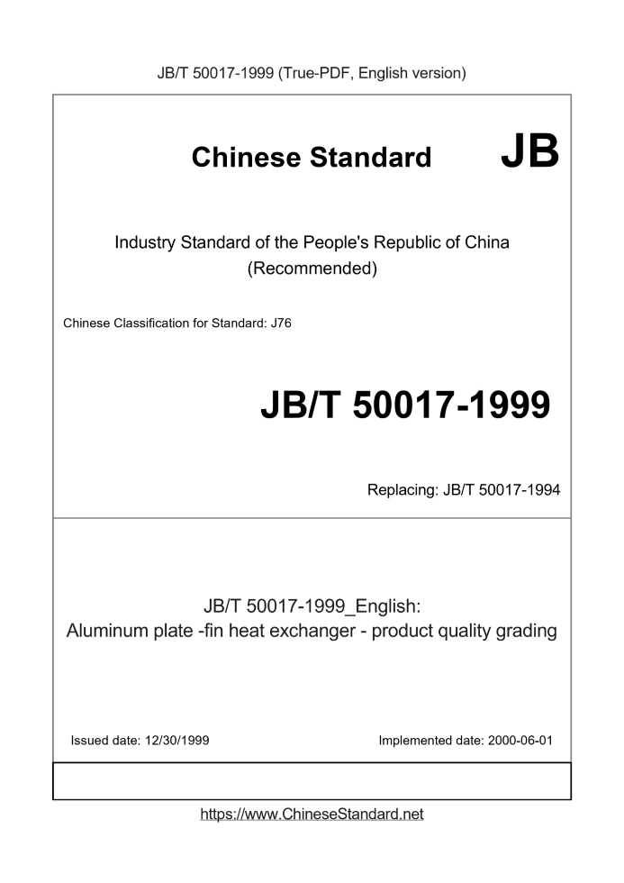 | JB/T 50017-1999 English PDFUS$239.00 ยท In stock Delivery: <= 2 days. True-PDF full-copy in English will be manually translated and delivered via email. JB/T 50017-1999: Aluminum plate -fin heat exchanger - product quality grading Status: Obsolete JB/T 50017: Historical versions