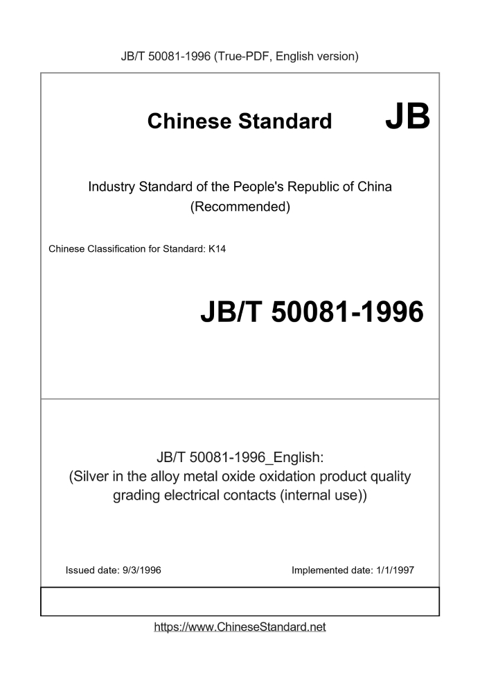 | JB/T 50081-1996 English PDFUS$239.00 ยท In stock Delivery: <= 2 days. True-PDF full-copy in English will be manually translated and delivered via email. JB/T 50081-1996: (Silver in the alloy metal oxide oxidation product quality grading electrical contacts (internal use)) Status: Obsolete