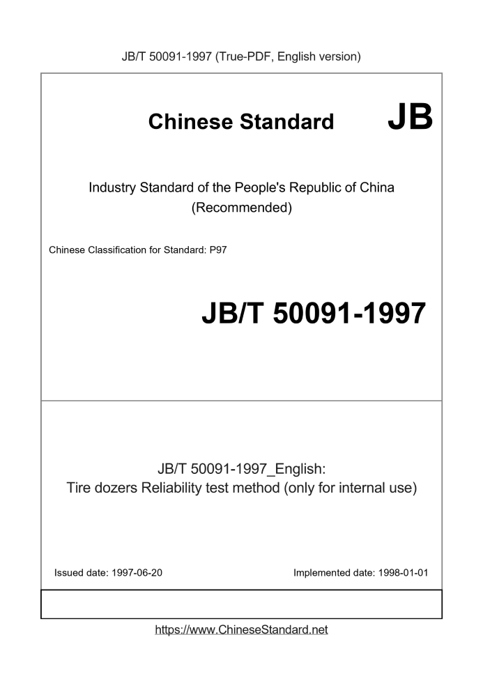 Delivery: <= 3 days. True-PDF full-copy in English will be manually translated and delivered via email. JB/T 50091-1997: Tire dozers Reliability test method (only for internal use) Status: Obsolete