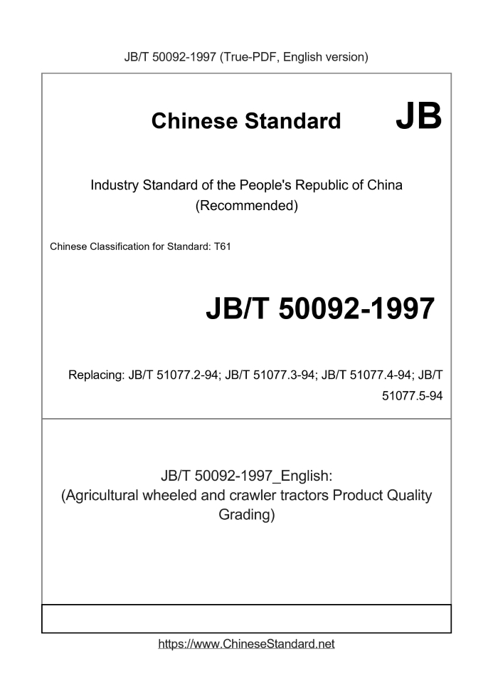 Delivery: <= 4 days. True-PDF full-copy in English will be manually translated and delivered via email. JB/T 50092-1997: (Agricultural wheeled and crawler tractors Product Quality Grading) Status: Obsolete