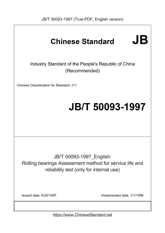 Delivery: <= 3 days. True-PDF full-copy in English will be manually translated and delivered via email. JB/T 50093-1997: Rolling bearings Assessment method for service life and reliability test (only for internal use) Status: Obsolete