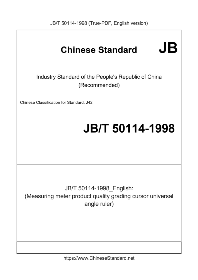Delivery: <= 3 days. True-PDF full-copy in English will be manually translated and delivered via email. JB/T 50114-1998: (Measuring meter product quality grading cursor universal angle ruler) Status: Obsolete