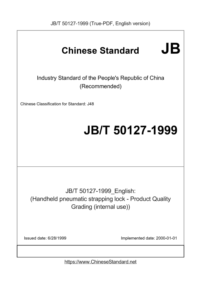 Delivery: <= 3 days. True-PDF full-copy in English will be manually translated and delivered via email. JB/T 50127-1999: (Handheld pneumatic strapping lock - Product Quality Grading (internal use)) Status: Obsolete