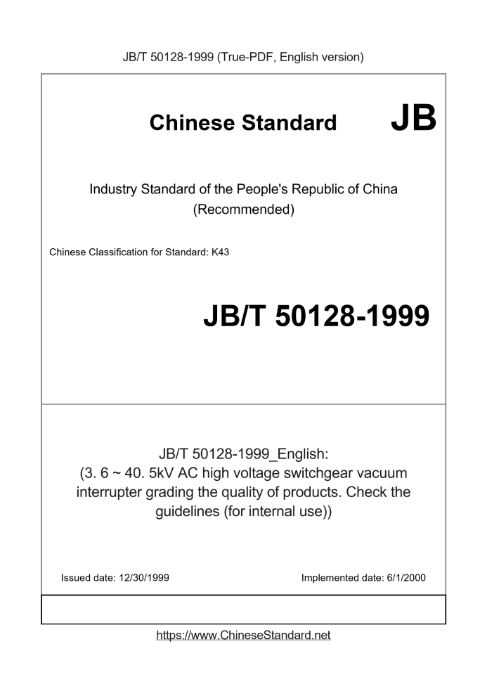 Delivery: <= 3 days. True-PDF full-copy in English will be manually translated and delivered via email. JB/T 50128-1999: (3. 6 ~ 40. 5kV AC high voltage switchgear vacuum interrupter grading the quality of products. Check the guidelines (for internal use)) Status: Obsolete