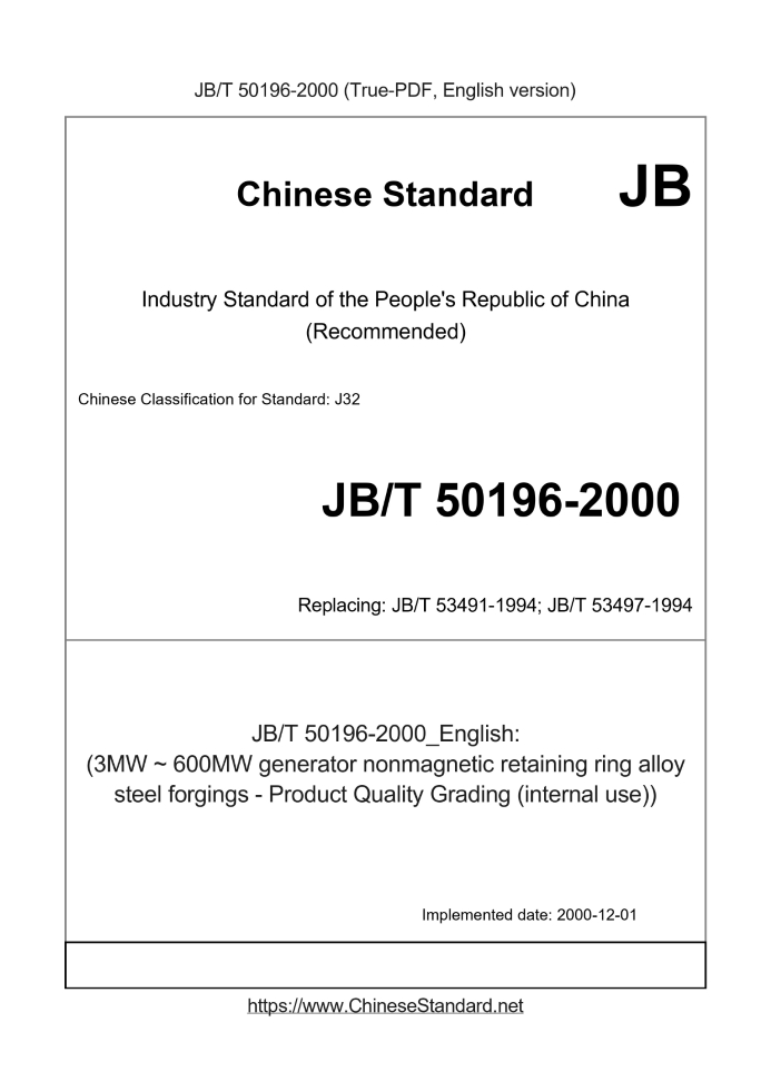 Delivery: <= 3 days. True-PDF full-copy in English will be manually translated and delivered via email. JB/T 50196-2000: (3MW ~ 600MW generator nonmagnetic retaining ring alloy steel forgings - Product Quality Grading (internal use)) Status: Obsolete