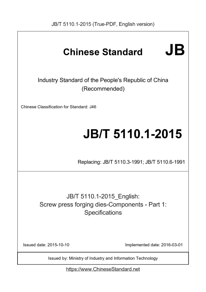 Delivery: <= 3 days. True-PDF full-copy in English will be manually translated and delivered via email. JB/T 5110.1-2015: Screw press forging dies-Components - Part 1: Specifications Status: Valid JB/T 5110.1: Historical versions