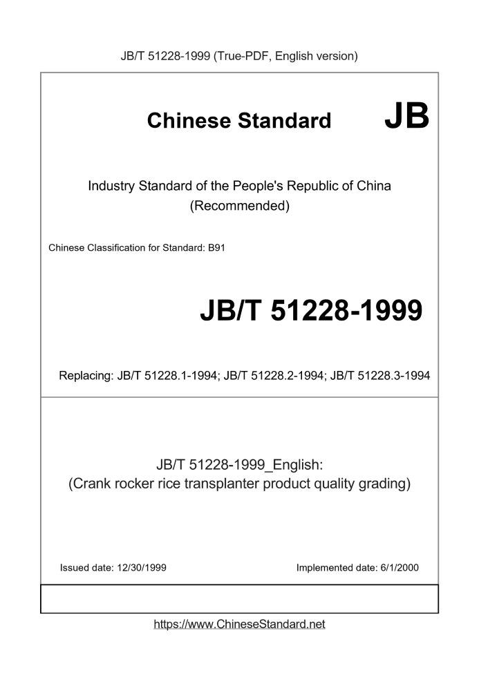 | JB/T 51228-1999 English PDFUS$279.00 ยท In stock Delivery: <= 3 days. True-PDF full-copy in English will be manually translated and delivered via email. JB/T 51228-1999: (Crank rocker rice transplanter product quality grading) Status: Obsolete