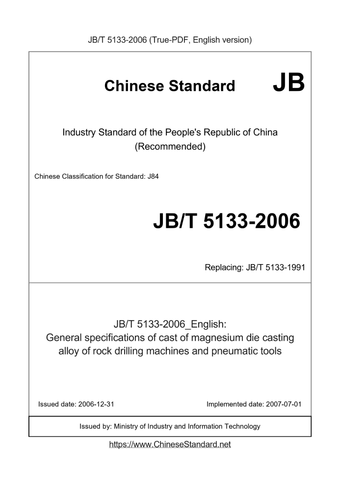Delivery: <= 3 days. True-PDF full-copy in English will be manually translated and delivered via email. JB/T 5133-2006: General specifications of cast of magnesium die casting alloy of rock drilling machines and pneumatic tools Status: Valid JB/T 5133: Historical versions