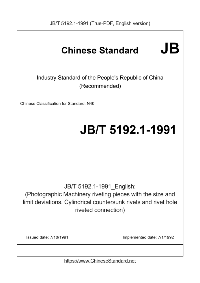 | JB/T 5192.1-1991 English PDFUS$199.00 ยท In stock Delivery: <= 2 days. True-PDF full-copy in English will be manually translated and delivered via email. JB/T 5192.1-1991: (Photographic Machinery riveting pieces with the size and limit deviations. Cylindrical countersunk rivets and rivet hole riveted connection) Status: Obsolete
