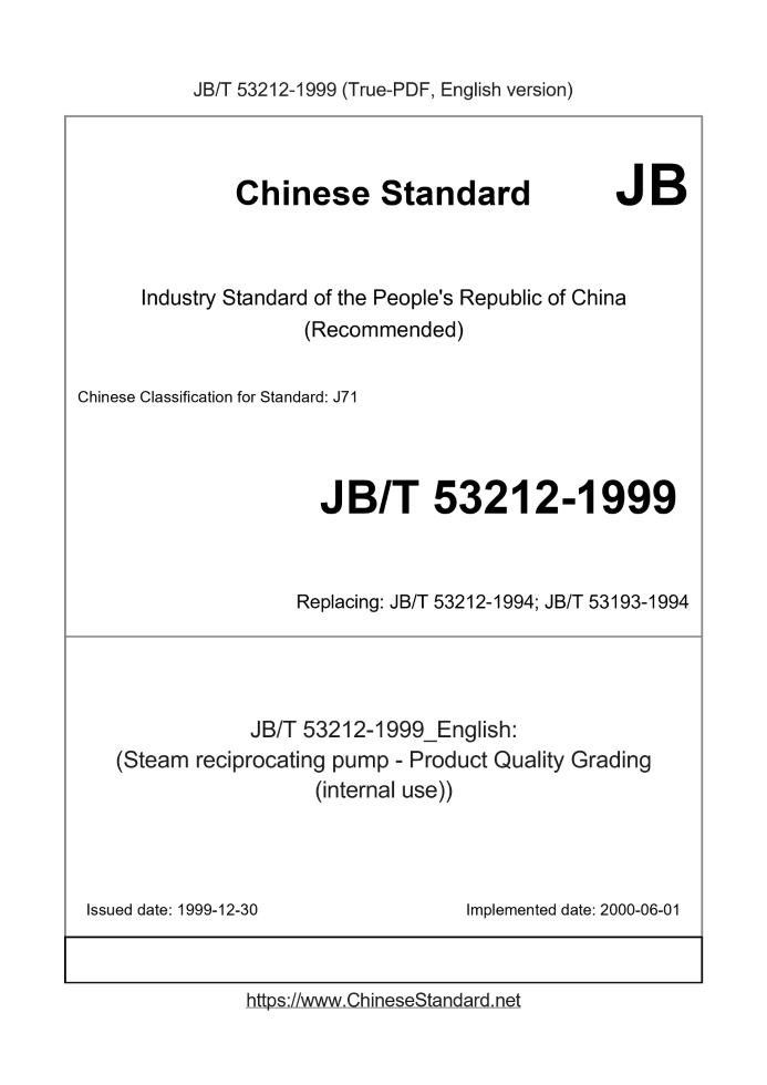 | JB/T 53212-1999 English PDFUS$359.00 ยท In stock Delivery: <= 3 days. True-PDF full-copy in English will be manually translated and delivered via email. JB/T 53212-1999: (Steam reciprocating pump - Product Quality Grading (internal use)) Status: Obsolete JB/T 53212: Historical versions