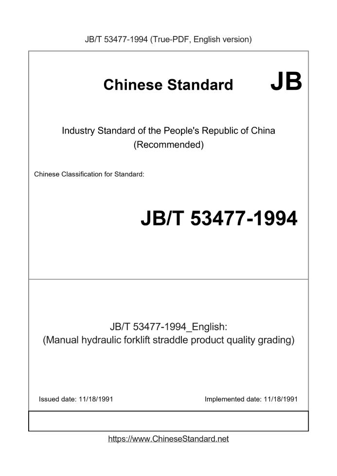 Basic dataStandard ID: JB/T 53477-1994 (JB/T53477-1994)Description (Translated English): (Manual hydraulic forklift straddle product quality grading) Sector / Industry: Mechanical & Machinery Industry Standard (Recommended) Date of Issue: 11/18/1991 Date of Implementation: 11/18/1991 Tips & Frequently Asked Questions:Question 1: How long will the true-PDF of JB/T 53477-1994_English be delivered?Answer: Upon your order, we will start to translate JB/T 53477-1994_English as soon as possible, and keep you informed of the progress. The lead time is typically 1 ~ 3 working days. The lengthier the document the longer the lead time.Question 2: Can I share the purchased PDF of JB/T 53477-1994_English with my colleagues?Answer: Yes. The purchased PDF of JB/T 53477-1994_English will be deemed to be sold to your employer/organization who actually pays for it, including your colleagues and your employer's intranet.Question 3: Does the price include tax/VAT?Answer: Yes. Our tax invoice, downloaded/delivered in 9 seconds, includes all tax/VAT and complies with 100+ countries' tax regulations (tax exempted in 100+ countries) -- See Avoidance of Double Taxation Agreements (DTAs): List of DTAs signed between Singapore and 100+ countriesQuestion 4: Do you accept my currency other than USD?Answer: Yes. If you need your currency to be printed on the invoice, please write an email to Sales@ChineseStandard.net. In 2 working-hours, we will create a special link for you to pay in any currencies. Otherwise, follow the normal steps: Add to Cart -- Checkout -- Select your currency to pay. |