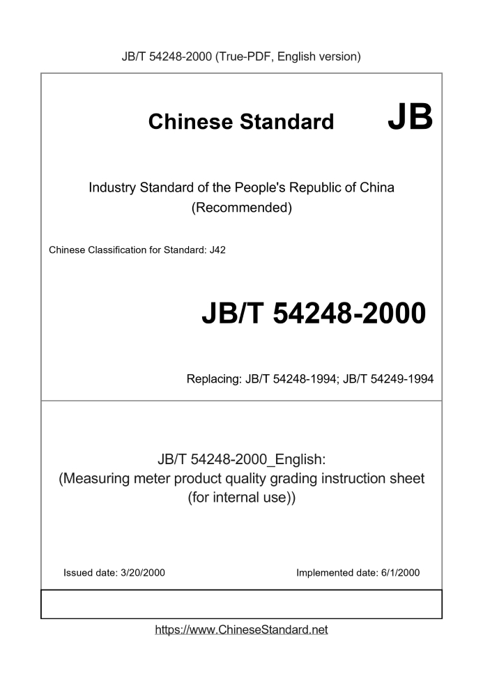 Delivery: <= 3 days. True-PDF full-copy in English will be manually translated and delivered via email. JB/T 54248-2000: (Measuring meter product quality grading instruction sheet (for internal use)) Status: Obsolete JB/T 54248: Historical versions