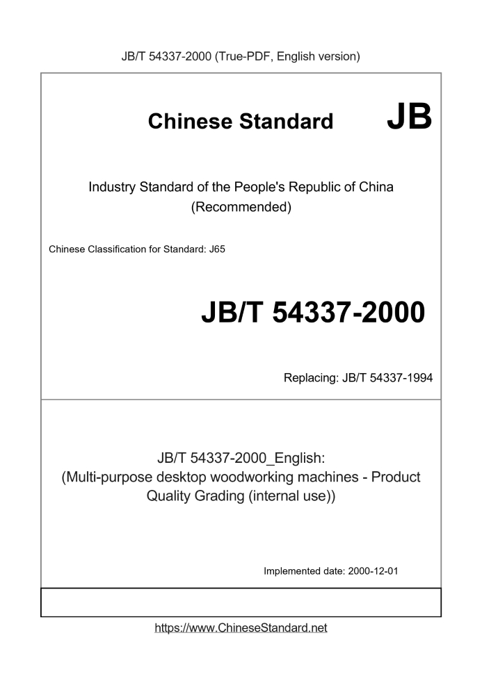 Delivery: <= 5 days. True-PDF full-copy in English will be manually translated and delivered via email. JB/T 54337-2000: (Multi-purpose desktop woodworking machines - Product Quality Grading (internal use)) Status: Obsolete