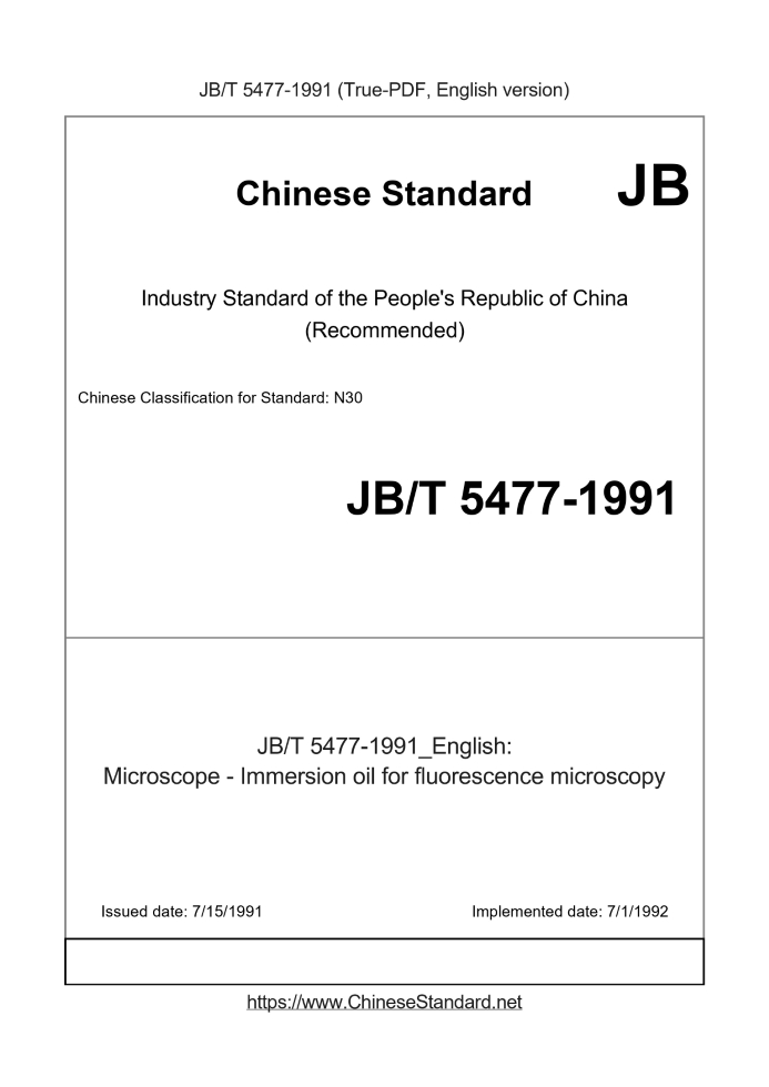Delivery: <= 3 days. True-PDF full-copy in English will be manually translated and delivered via email. JB/T 5477-1991: Microscope - Immersion oil for fluorescence microscopy Status: Obsolete