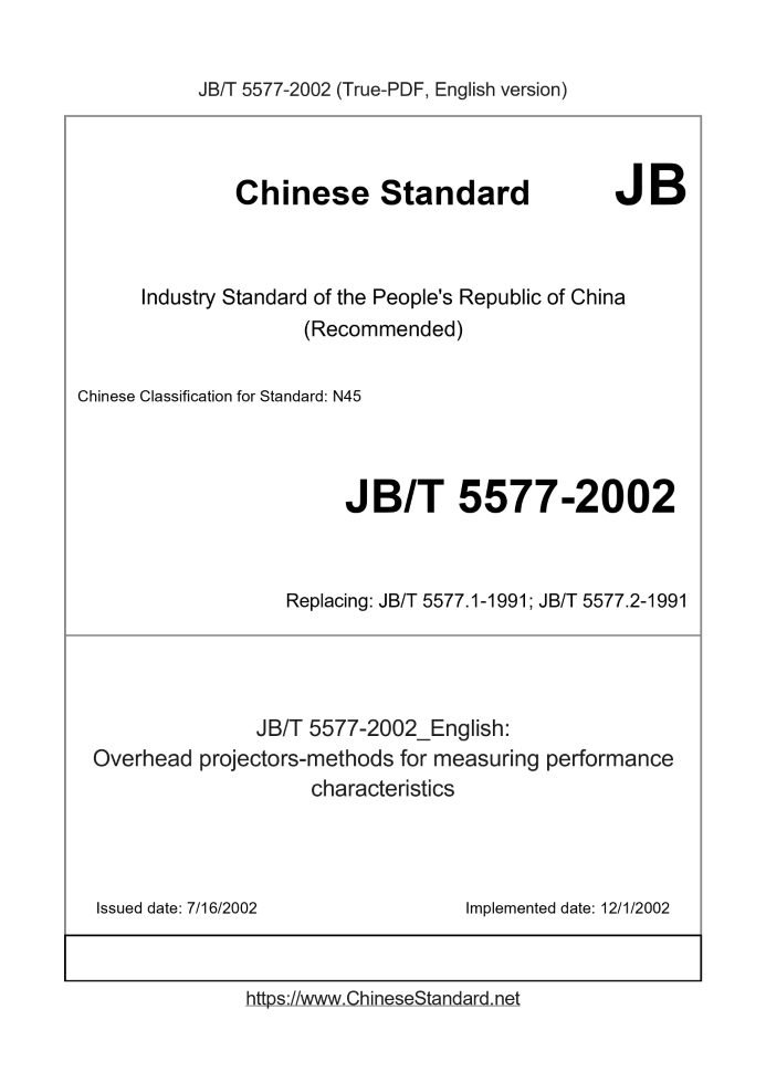 Delivery: <= 3 days. True-PDF full-copy in English will be manually translated and delivered via email. JB/T 5577-2002: Overhead projectors-methods for measuring performance characteristics Status: Obsolete JB/T 5577: Historical versions