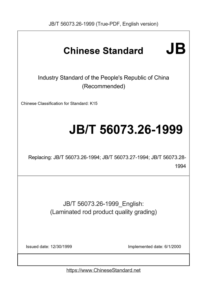 Delivery: <= 3 days. True-PDF full-copy in English will be manually translated and delivered via email. JB/T 56073.26-1999: (Laminated rod product quality grading) Status: Obsolete