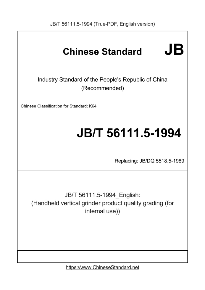 Delivery: <= 3 days. True-PDF full-copy in English will be manually translated and delivered via email. JB/T 56111.5-1994: (Handheld vertical grinder product quality grading (for internal use)) Status: Obsolete