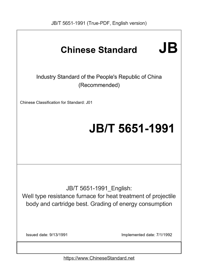 Delivery: <= 2 days. True-PDF full-copy in English will be manually translated and delivered via email. JB/T 5651-1991: Well type resistance furnace for heat treatment of projectile body and cartridge best. Grading of energy consumption Status: Obsolete