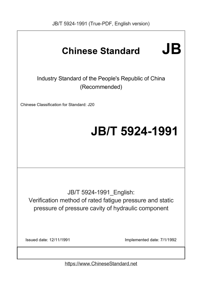Delivery: <= 3 days. True-PDF full-copy in English will be manually translated and delivered via email. JB/T 5924-1991: Verification method of rated fatigue pressure and static pressure of pressure cavity of hydraulic component Status: Obsolete