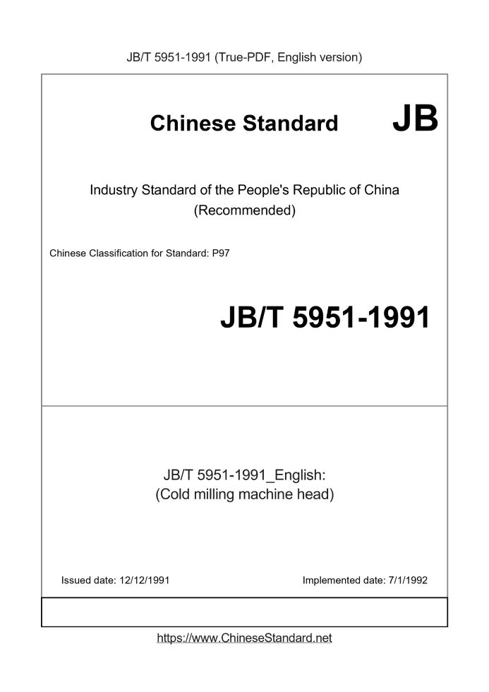 Delivery: <= 2 days. True-PDF full-copy in English will be manually translated and delivered via email. JB/T 5951-1991: (Cold milling machine head) Status: Obsolete