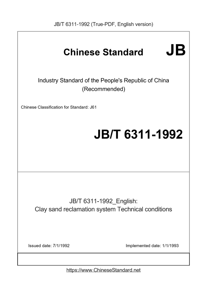 Delivery: <= 2 days. True-PDF full-copy in English will be manually translated and delivered via email. JB/T 6311-1992: Clay sand reclamation system Technical conditions Status: Obsolete