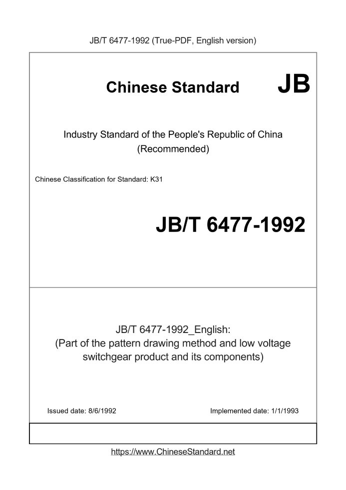 Delivery: <= 5 days. True-PDF full-copy in English will be manually translated and delivered via email. JB/T 6477-1992: (Part of the pattern drawing method and low voltage switchgear product and its components) Status: Obsolete
