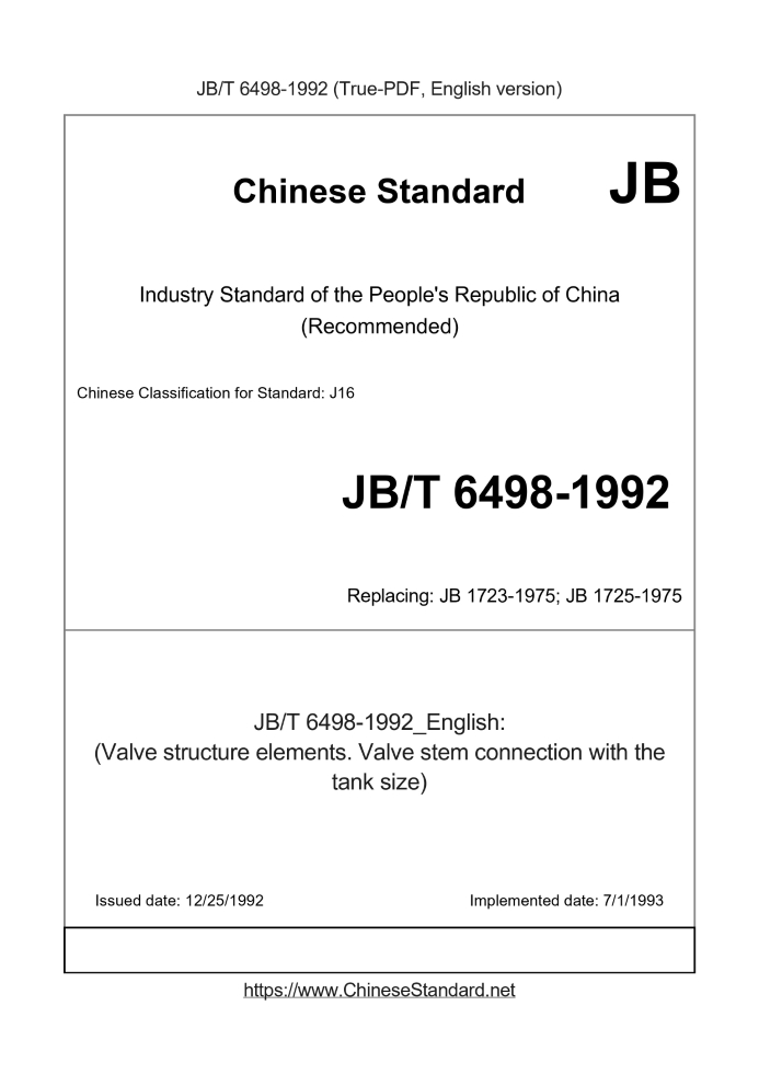 Delivery: <= 2 days. True-PDF full-copy in English will be manually translated and delivered via email. JB/T 6498-1992: (Valve structure elements. Valve stem connection with the tank size) Status: Obsolete