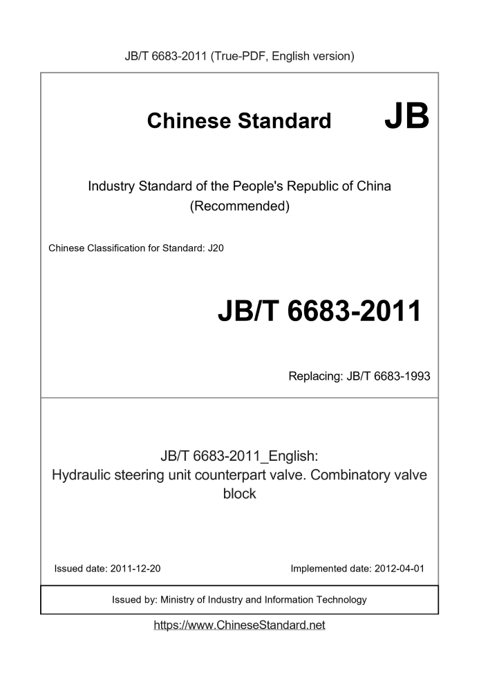 Delivery: <= 3 days. True-PDF full-copy in English will be manually translated and delivered via email. JB/T 6683-2011: Hydraulic steering unit counterpart valve. Combinatory valve block Status: Valid JB/T 6683: Historical versions
