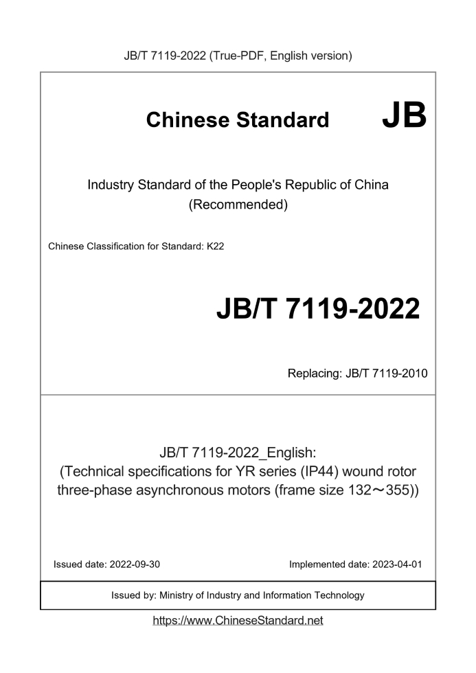 Delivery: <= 4 days. True-PDF full-copy in English will be manually translated and delivered via email. JB/T 7119-2022: (Technical specifications for YR series (IP44) wound rotor three-phase asynchronous motors (frame size 132~355)) Status: Valid JB/T 7119: Historical versions