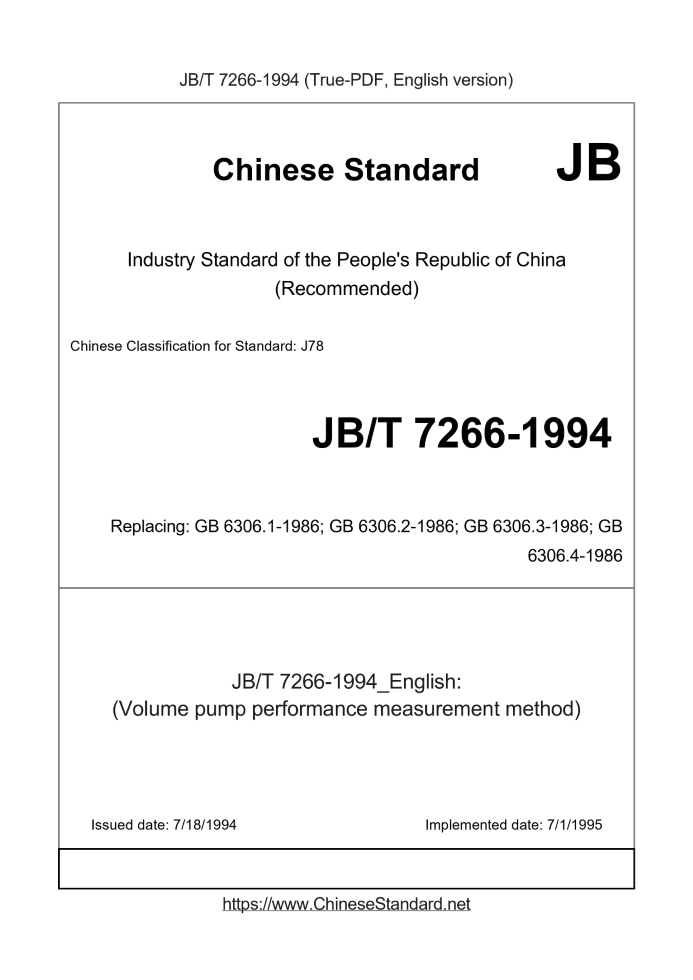 Delivery: <= 3 days. True-PDF full-copy in English will be manually translated and delivered via email. JB/T 7266-1994: (Volume pump performance measurement method) Status: Obsolete