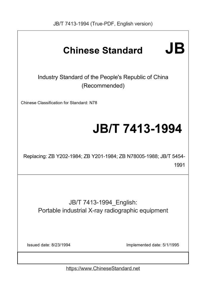 Delivery: <= 3 days. True-PDF full-copy in English will be manually translated and delivered via email. JB/T 7413-1994: Portable industrial X-ray radiographic equipment Status: Obsolete