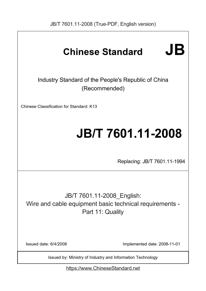 Delivery: <= 3 days. True-PDF full-copy in English will be manually translated and delivered via email. JB/T 7601.11-2008: Wire and cable equipment basic technical requirements - Part 11: Quality Status: Valid JB/T 7601.11: Historical versions