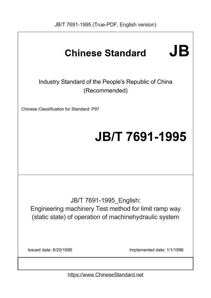 Delivery: <= 3 days. True-PDF full-copy in English will be manually translated and delivered via email. JB/T 7691-1995: Engineering machinery Test method for limit ramp way (static state) of operation of machinehydraulic system Status: Obsolete