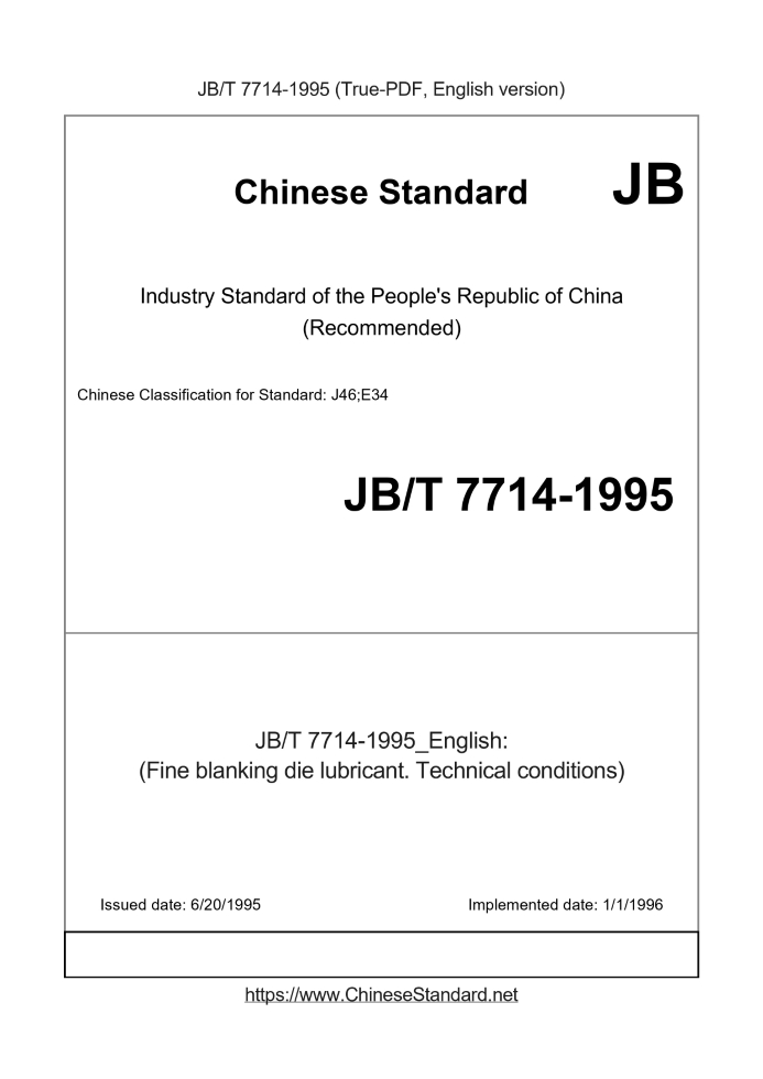 Delivery: <= 2 days. True-PDF full-copy in English will be manually translated and delivered via email. JB/T 7714-1995: (Fine blanking die lubricant. Technical conditions) Status: Obsolete