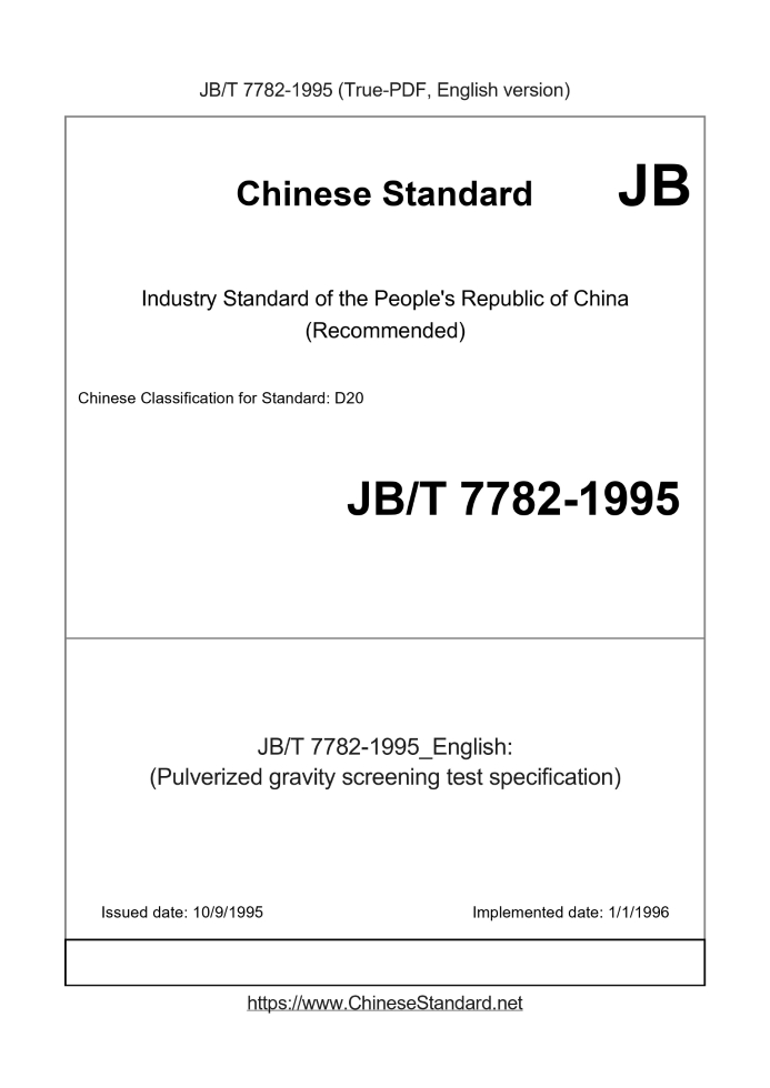 Delivery: <= 2 days. True-PDF full-copy in English will be manually translated and delivered via email. JB/T 7782-1995: (Pulverized gravity screening test specification) Status: Obsolete