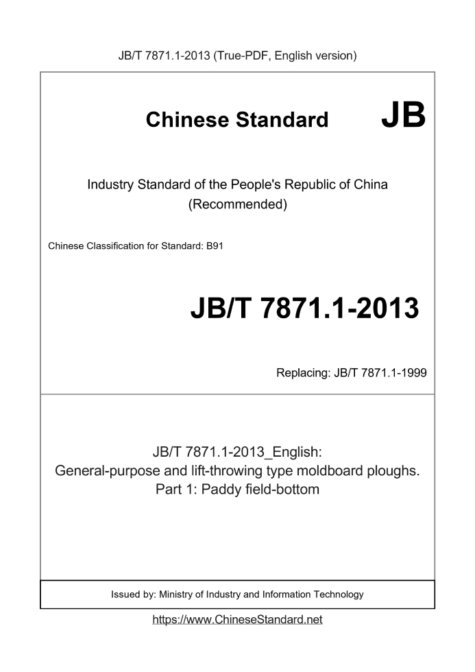 Delivery: <= 3 days. True-PDF full-copy in English will be manually translated and delivered via email. JB/T 7871.1-2013: General-purpose and lift-throwing type moldboard ploughs. Part 1: Paddy field-bottom Status: Valid JB/T 7871.1: Historical versions