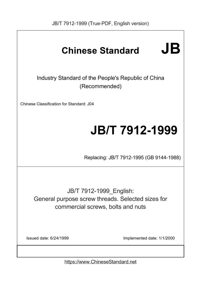 JB/T 7912-1999: General purpose screw threads. Selected sizes for commercial screws, bolts and nuts