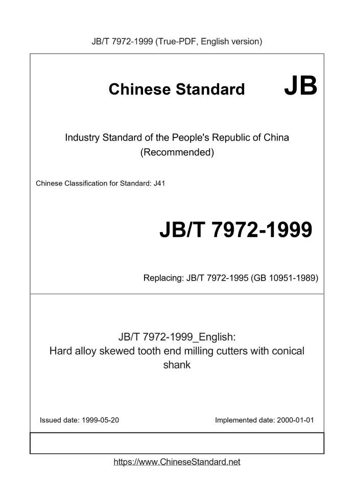 Delivery: <= 2 days. True-PDF full-copy in English will be manually translated and delivered via email. JB/T 7972-1999: Hard alloy skewed tooth end milling cutters with conical shank Status: Obsolete JB/T 7972: Historical versions