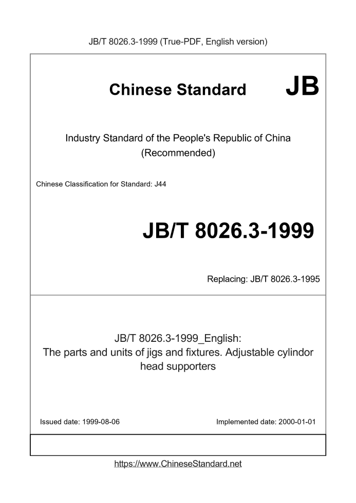 Delivery: <= 2 days. True-PDF full-copy in English will be manually translated and delivered via email. JB/T 8026.3-1999: The parts and units of jigs and fixtures. Adjustable cylindor head supporters JB/T 8026.3: Historical versions