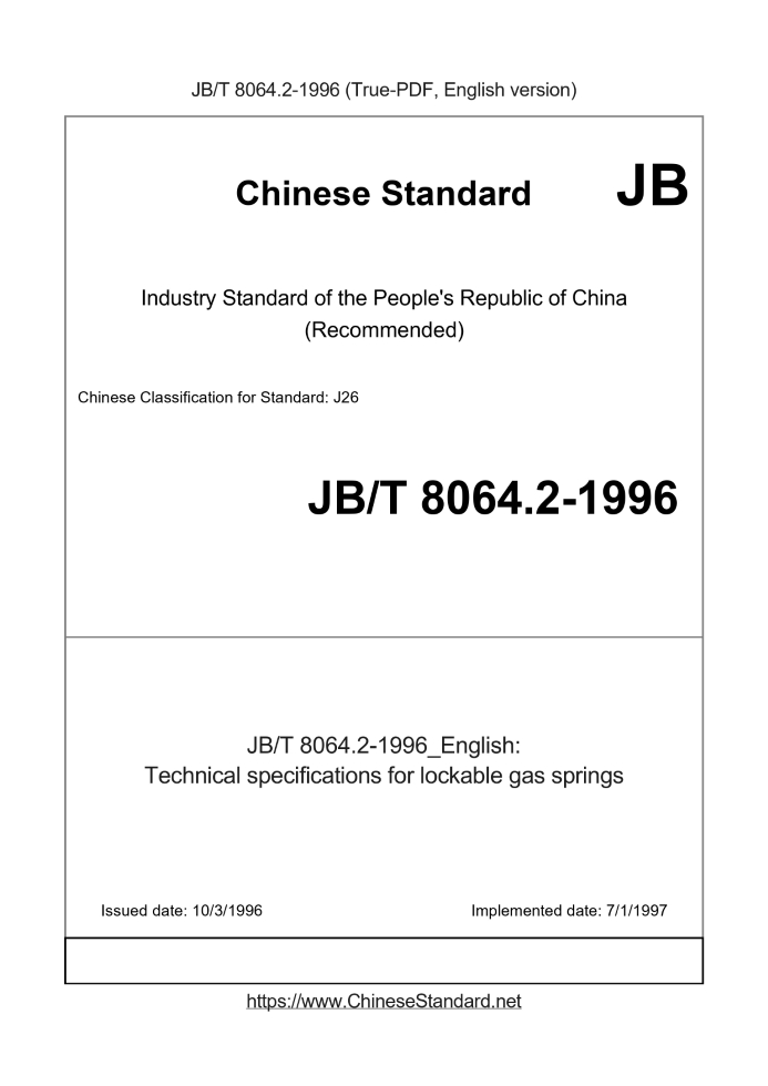Delivery: <= 3 days. True-PDF full-copy in English will be manually translated and delivered via email. JB/T 8064.2-1996: Technical specifications for lockable gas springs Status: Obsolete