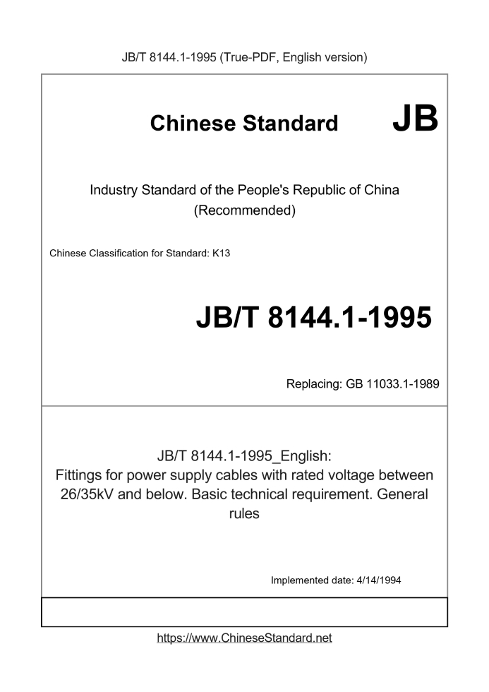 Delivery: <= 2 days. True-PDF full-copy in English will be manually translated and delivered via email. JB/T 8144.1-1995: Fittings for power supply cables with rated voltage between 26/35kV and below. Basic technical requirement. General rules Status: Obsolete