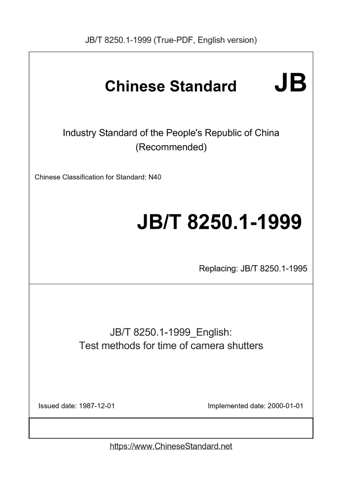 Delivery: <= 3 days. True-PDF full-copy in English will be manually translated and delivered via email. JB/T 8250.1-1999: Test methods for time of camera shutters JB/T 8250.1: Historical versions